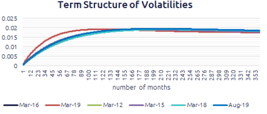 To underscore the transparency of the Local Vol model, a historical trend of the term structure of volatilities is provided. The graph depicts the projected one-month interest rate volatilities of the Local Volatilities Model.